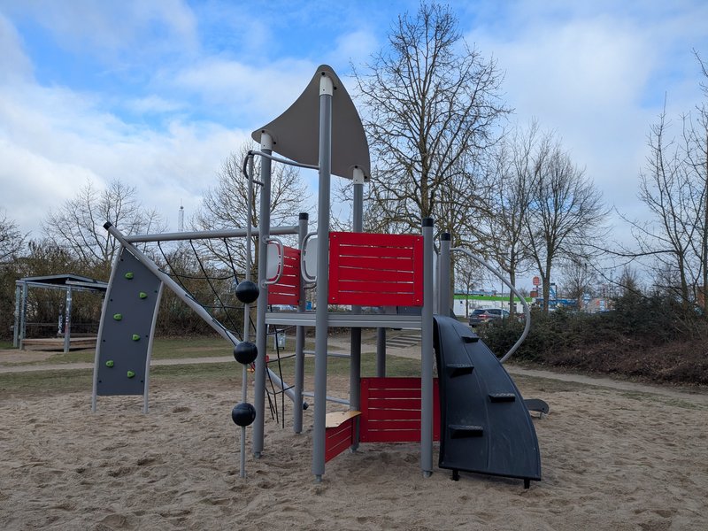 Am 25.03.2026 hat der Spielplatz Haselstraße/Eicheneck ein neues Spielgerät erhalten, das gezielt für Kinder im Alter von 6 bis 12 Jahren konzipiert ist. Damit konnte eine bisherige Lücke geschlossen, da es bislang kein passendes Angebot für diese mittlere Altersgruppe gab. Das neue Spielgerät orientiert sich gestalterisch am bereits vorhandenen Angebot für jüngere Kinder und fügt sich somit in das Gesamtbild des Spielplatzes ein. Das Spielgerät besteht aus zwei aneinandergrenzenden Türmen mit einer Rutsche, einem Leiteraufstieg, einer Ballstange, einer Schraubrampe, einem Kletternetz, einer Kletterwand sowie einem kleinen Spieltresen unterhalb eines Turms.